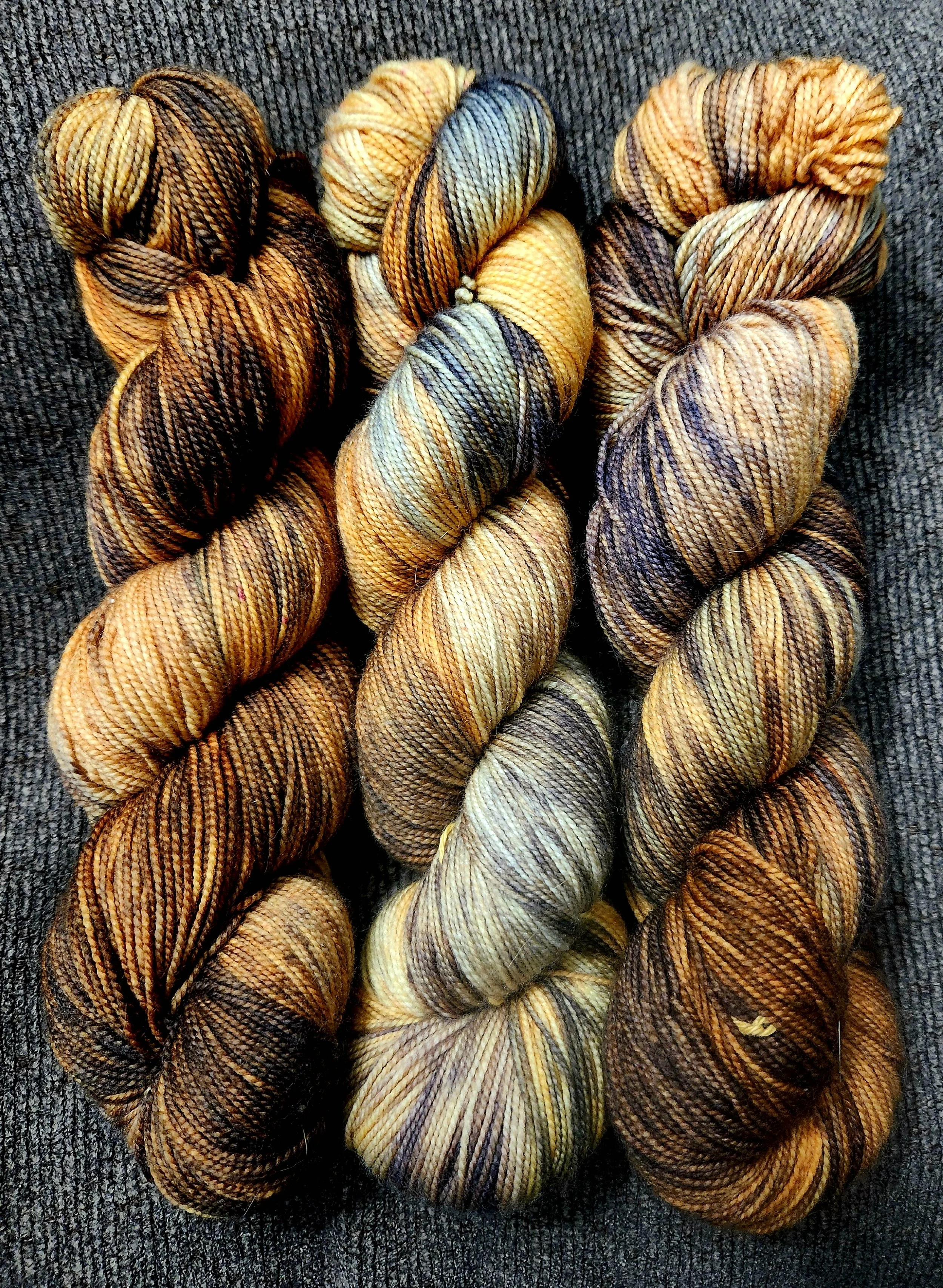 This colorway includes golden oranges, beige, browns, grays, and black.